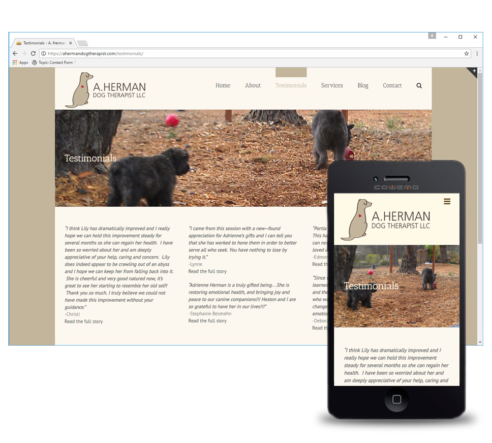 Recently redesigned to accommodate the increased users on mobile devices, Adrienne’s website now includes responsive HTML5, an event calendar and a sign up for new blog posts.